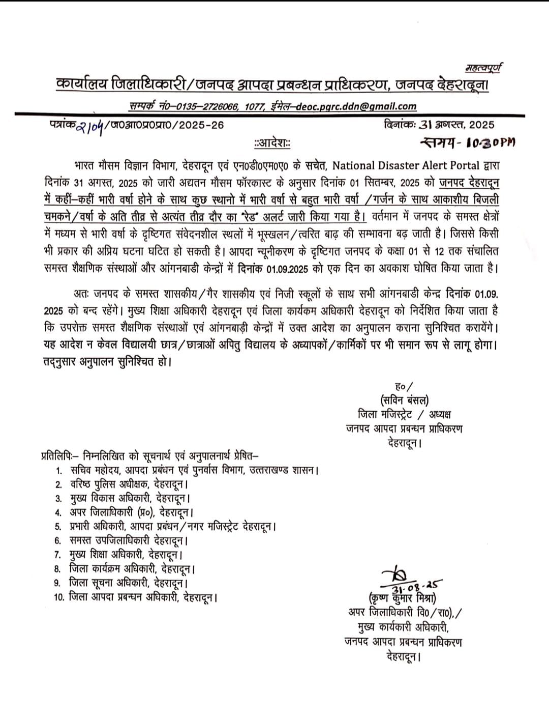 मौसम विभाग की चेतावनी को देखते हुए सभी जिलों में सोमवार (1 सितम्बर) को कक्षा 1 से 12 तक के सभी सरकारी, गैर-सरकारी/निजी स्कूलों और आंगनबाड़ी केंद्रों में अवकाश घोषित कर दिया गया है।