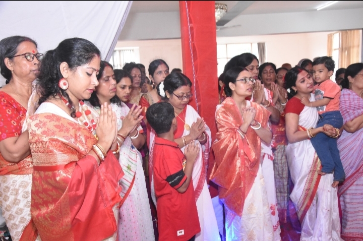 विसर्जन से पूर्व महिलाओं ने मां दुर्गा को सिंदूर अर्पित किया और एक-दूसरे को सिंदूर लगाकर मंगलकामनाएं दीं। इस पारंपरिक दृश्य ने पूरे पंडाल को उल्लास और अपनत्व की भावना से भर दिया।