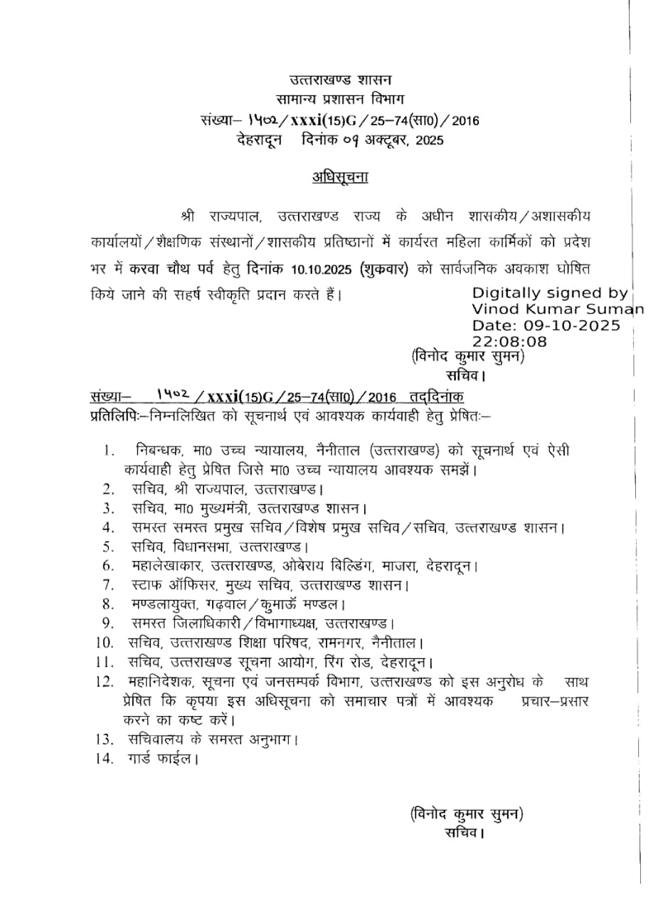 देहरादून। उत्तराखंड सरकार ने करवा चौथ के अवसर पर महिलाओं के लिए अवकाश की घोषणा कर दी है। शुक्रवार, 10 अक्टूबर को करवा चौथ का व्रत रखा जाएगा, जिसे लेकर महिलाएं पूरे दिन अवकाश की उम्मीद लगाए बैठी थीं। देर रात शासन से आदेश जारी होने के बाद महिलाओं में खुशी की लहर दौड़ गई।
