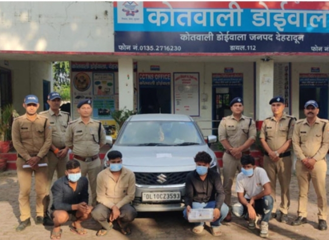 पुलिस टीम ने मुखबिर की सूचना पर चौकी हर्रावाला क्षेत्रान्तर्गत लक्ष्मण सिद्ध मंदिर के पास से संदिग्ध बलेनो कार (संख्या: DL-10-CZ-3593) से चार अभियुक्तों —