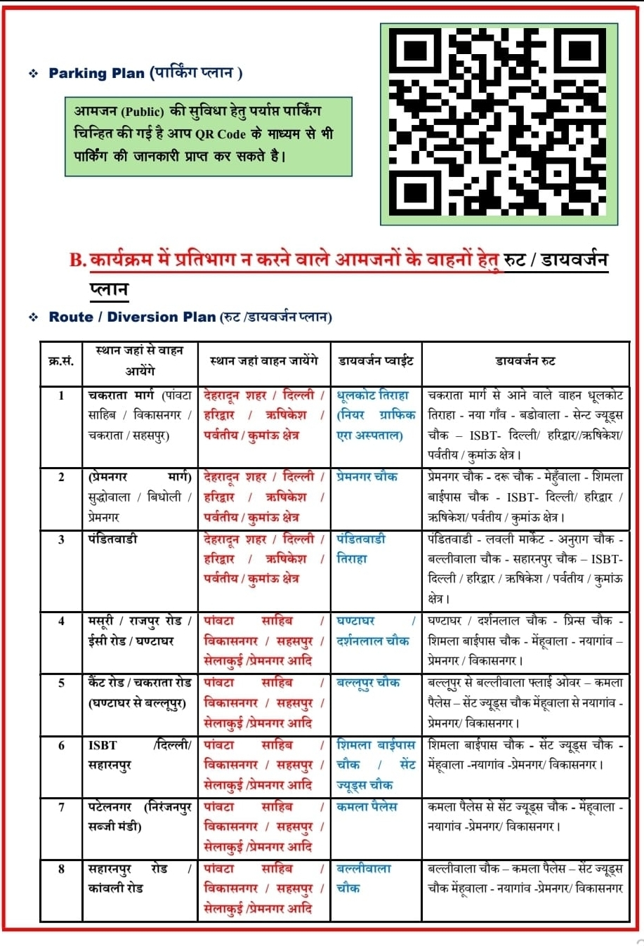दून पुलिस के अनुसार, ट्रैफिक प्लान 9 नवंबर को सुबह 6 बजे से रात 8 बजे तक लागू रहेगा, जबकि रूट डायवर्जन शाम 4 बजे तक प्रभावी रहेगा। इस दौरान शहर के अंदर और बाहर सभी भारी वाहनों के प्रवेश पर रोक रहेगी।